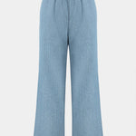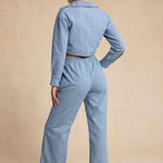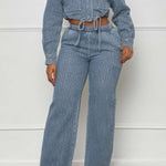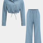 Elevate your casual wear with the Arden Denim Drawstring Set, a chic and comfortable two-piece ensemble. The cropped jacket features a drawstring waist for an adjustable fit, while the wide-leg pants offer both style and ease with an elastic waistband and relaxed silhouette. The unique woven denim fabric adds texture and interest, perfect for a laid-back yet fashionable look.