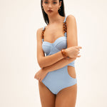 Make waves in the Azure Tide One-Piece, a stunning fusion of modern elegance and effortless allure. Featuring a structured bustier-style bodice with a flattering sweetheart neckline, this swimsuit offers both support and sophistication. The side cut-outs and waist tie create a sculpted silhouette, while the ribbed fabric enhances the textured appeal. Gold chain-link straps add a luxe touch, making this piece stand out in any setting.