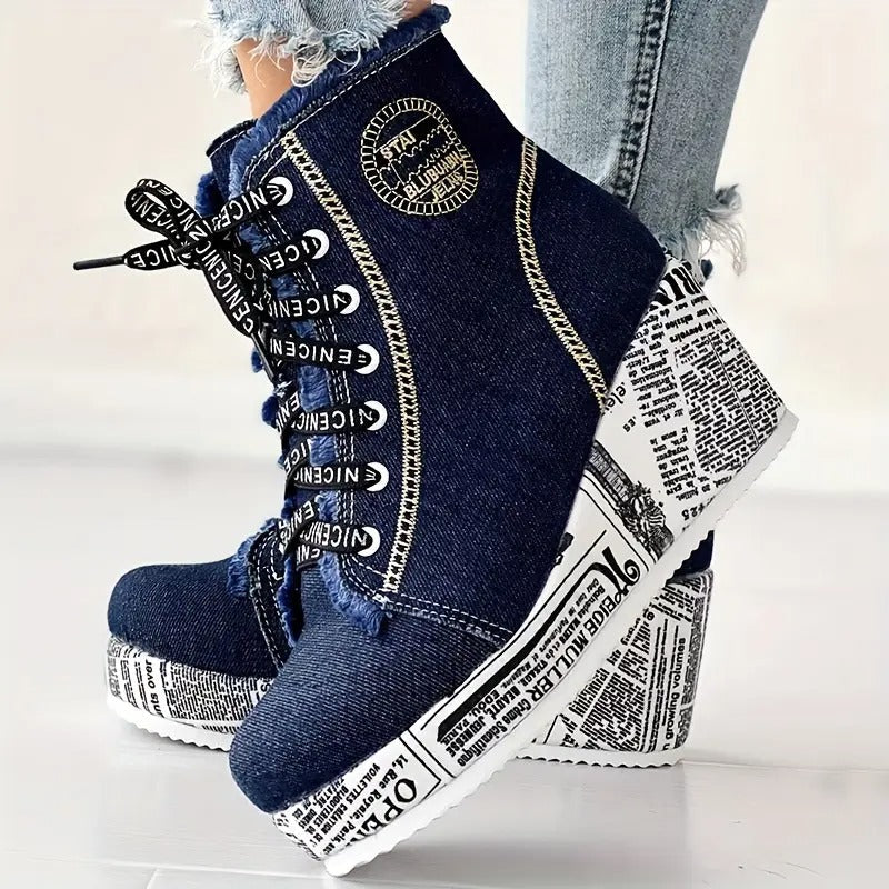Ces bottes en denim confortables à plateforme combinent originalité et modernité. Avec leur matière tendance et leur semelle épaisse, elles offrent à la fois style et confort pour affirmer votre look. Un choix audacieux pour celles et ceux qui aiment se démarquer.