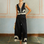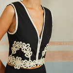 Channel effortless European charm in the Capri Embroidered Trim Two-Piece Set, a striking ensemble that’s all about detail. The sleeveless top features a deep V-neckline and zip-front closure, finished with delicate ivory embroidery that echoes along the hemline. The matching ankle-grazer pants continue the motif with embroidered flourishes for a bold yet elegant finish.