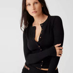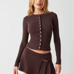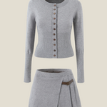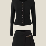 Chic, sculpted, and undeniably flirty — the Cleo Knit Button-Up And Mini Skirt Set is your new go-to for cool girl confidence. The ribbed knit cardigan hugs in all the right places with a pearl-button front and fitted silhouette, while the pleated mini skirt with buckle detail adds a playful, preppy edge.