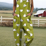 The Coop Stroll Jumpsuit brings quirky charm and laid-back comfort to your daily look. Dotted with playful cartoon chickens on a fresh green backdrop, it’s a cheerful nod to easy country living. Designed with a loose, comfy fit, deep front pockets, and rollable hems, it’s perfect for slow mornings, farmer’s markets, or just goofing around in style. With its adjustable straps and farm-fresh vibes, this overall makes every outing a little more fun—no rooster required.