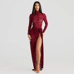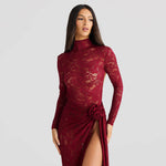 Own the spotlight in the Crimson Eclipse Two-Piece Maxi Set — a fierce and feminine ensemble that blends high drama with timeless allure. This head-turning set features a sheer lace bodysuit with a high neckline and long sleeves, paired with a matching floor-length lace skirt designed with a daring thigh-high slit and rosette tie detail at the waist.