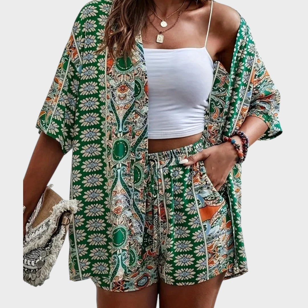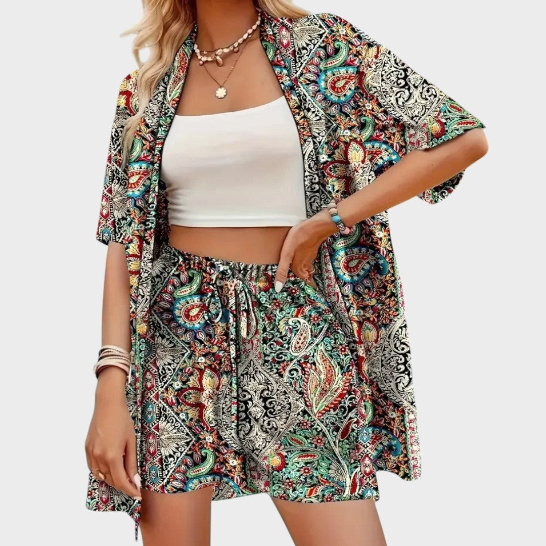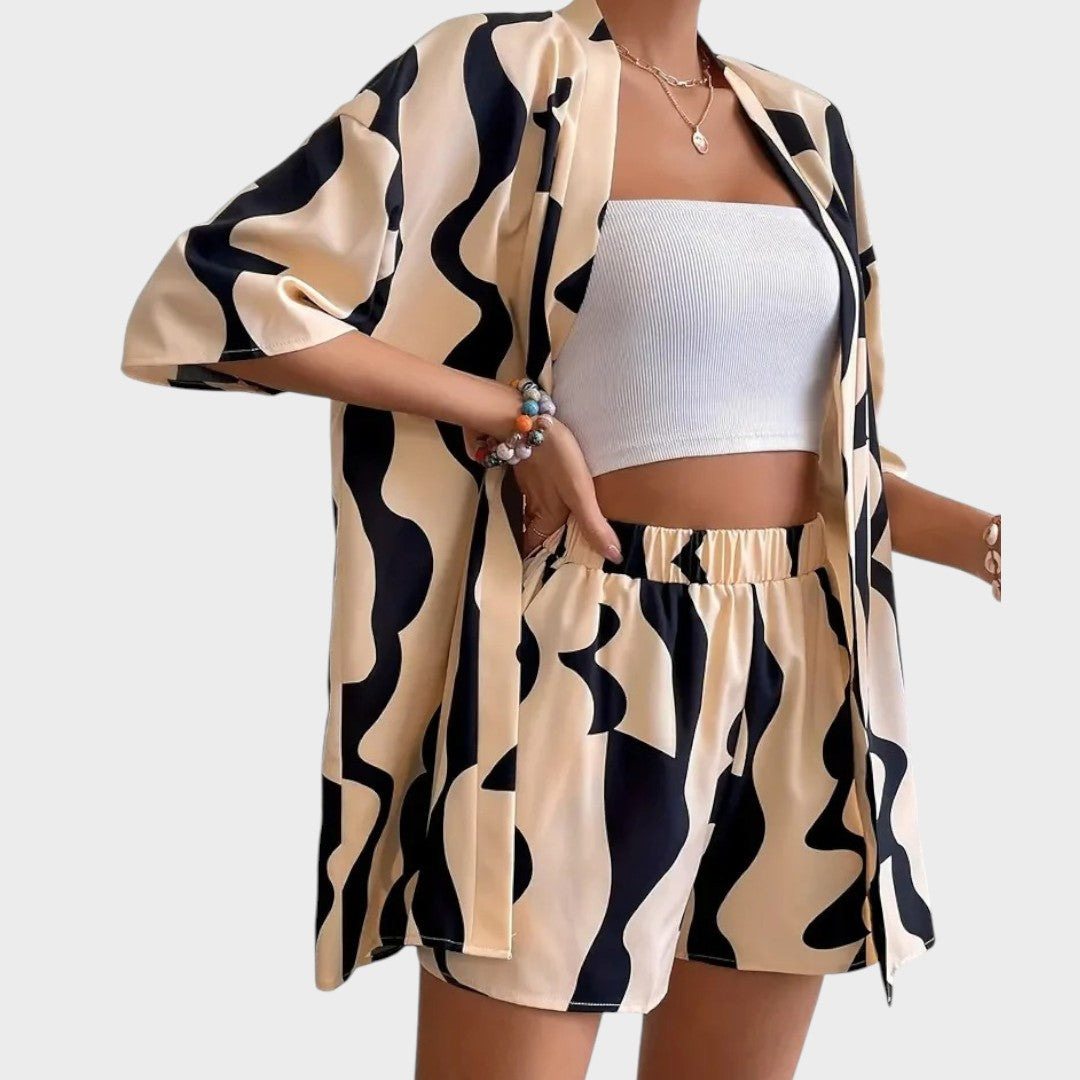 • Easy-breezy design – open shirt and comfy shorts for relaxed elegance.