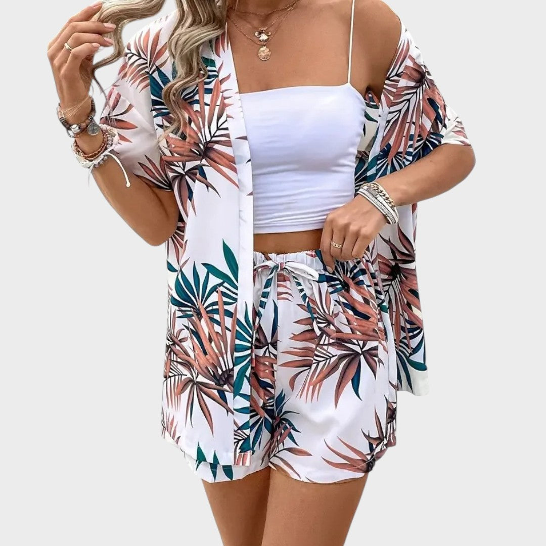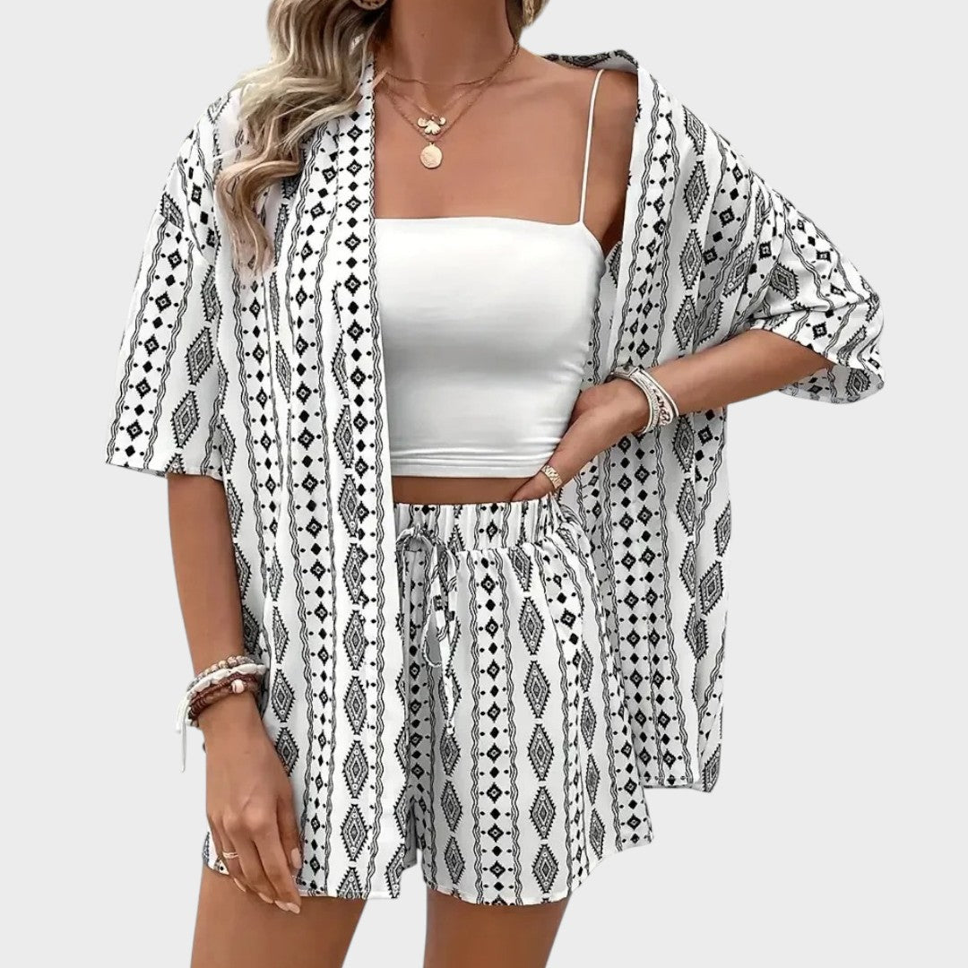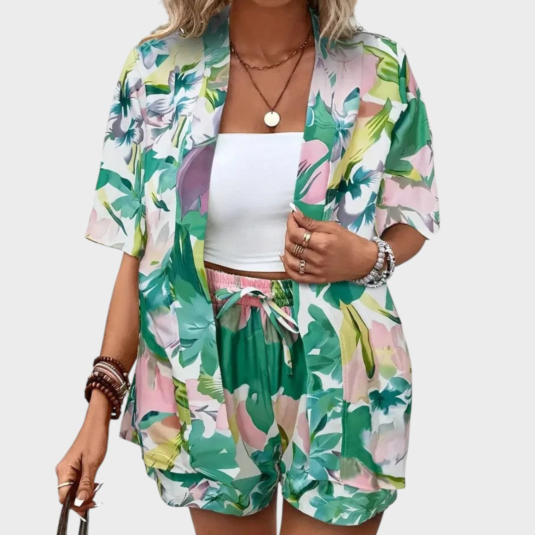 • Easy-breezy design – open shirt and comfy shorts for relaxed elegance.