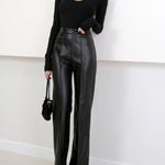 Give your outfit an edgy upgrade with the High-Waist Faux Leather Trousers. Crafted from premium vegan leather, these sleek trousers sculpt a flattering silhouette with their high-waisted design and streamlined fit—perfect for a bold, modern look with attitude.
