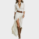 An elegant and timeless dress that combines the natural comfort of cotton with the lightness of linen, offering a chic yet pleasant look to wear. Designed with long sleeves and refined pleated lapels, it brings a sophisticated touch perfect for both casual occasions and dressed-up outings. Its flowing silhouette moves gracefully while ensuring ease and femininity.