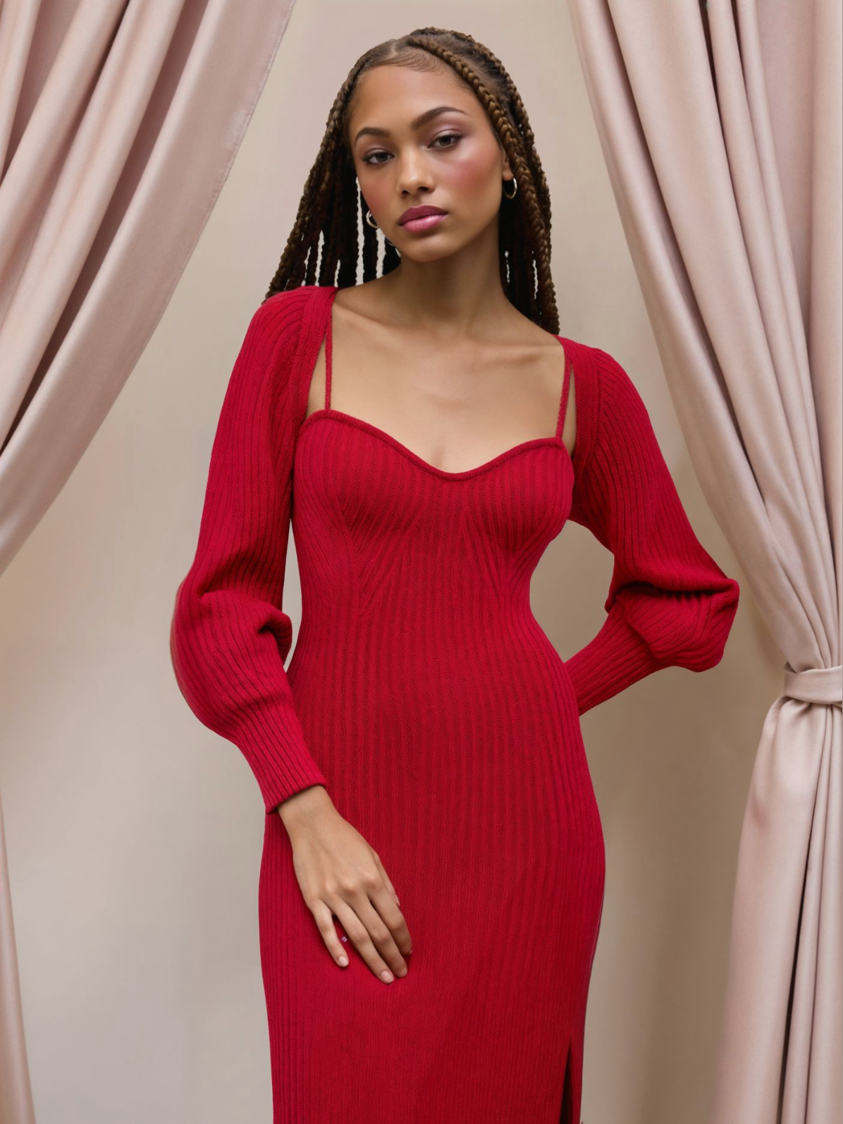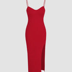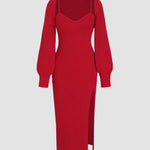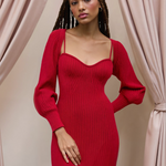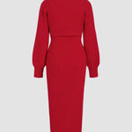 Make a refined statement with the Scarlet Elegance Knit Set. This stunning midi dress with a sleek side split comes paired with a matching shrug for a layered, sophisticated look. The fitted knit design flatters your silhouette, while the deep red hue exudes confidence and allure.