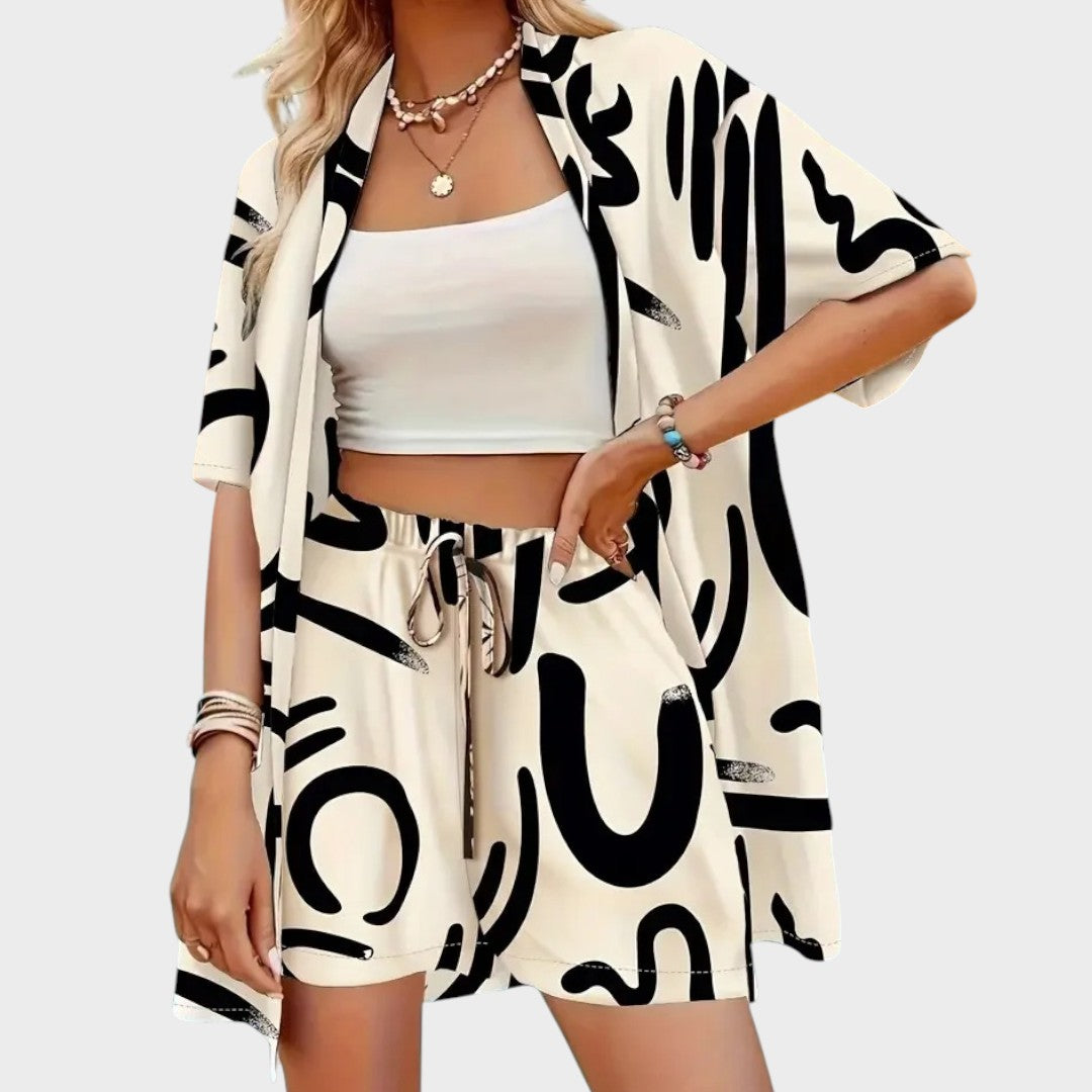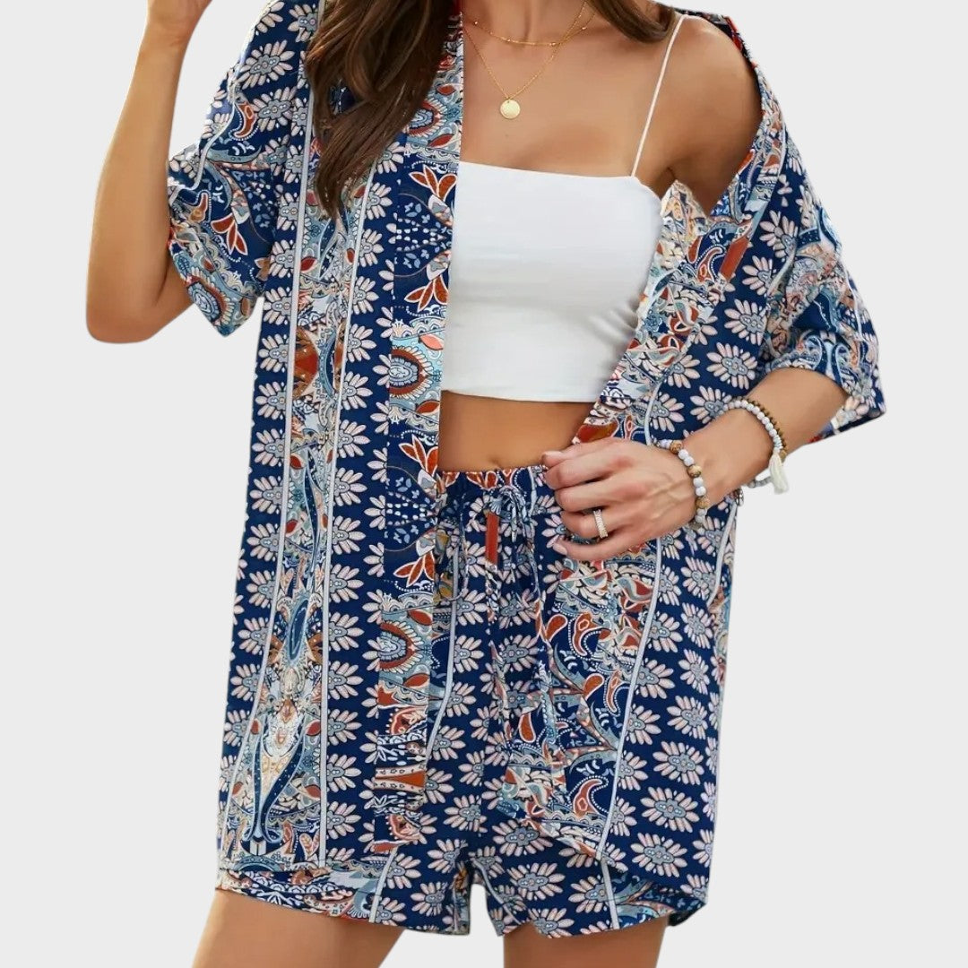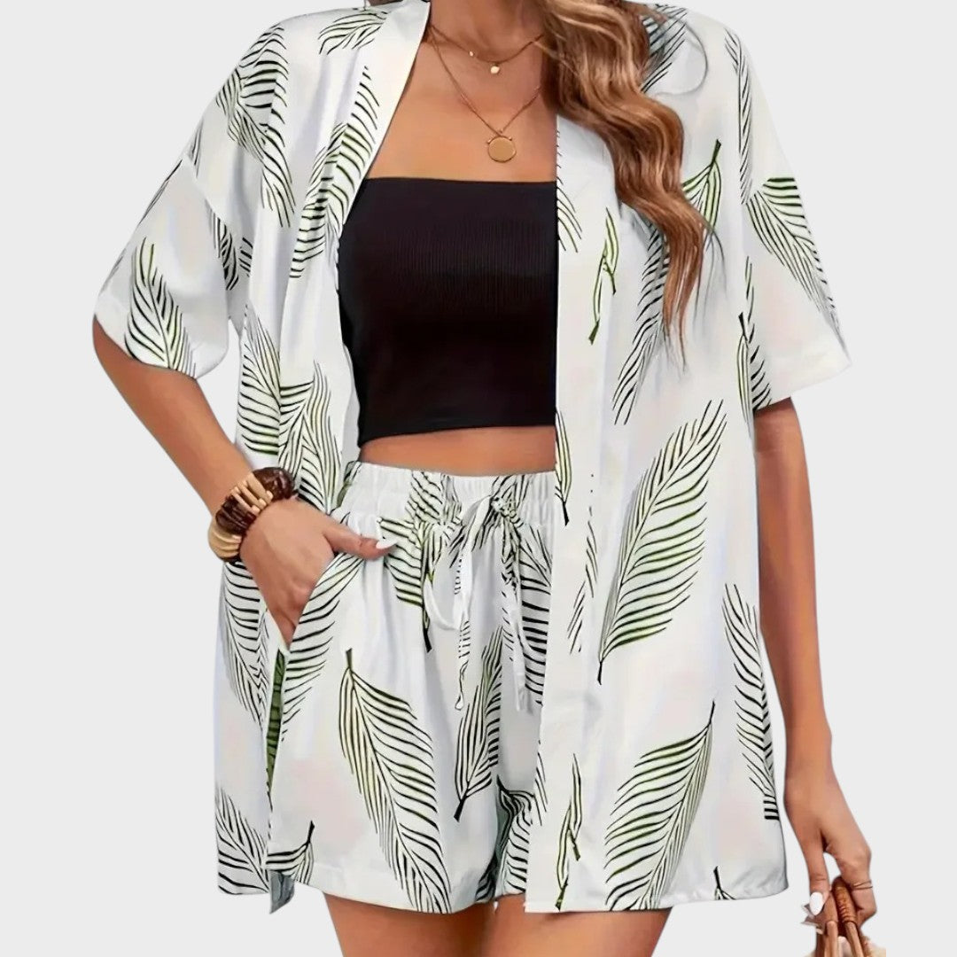 • Easy-breezy design – open shirt and comfy shorts for relaxed elegance.