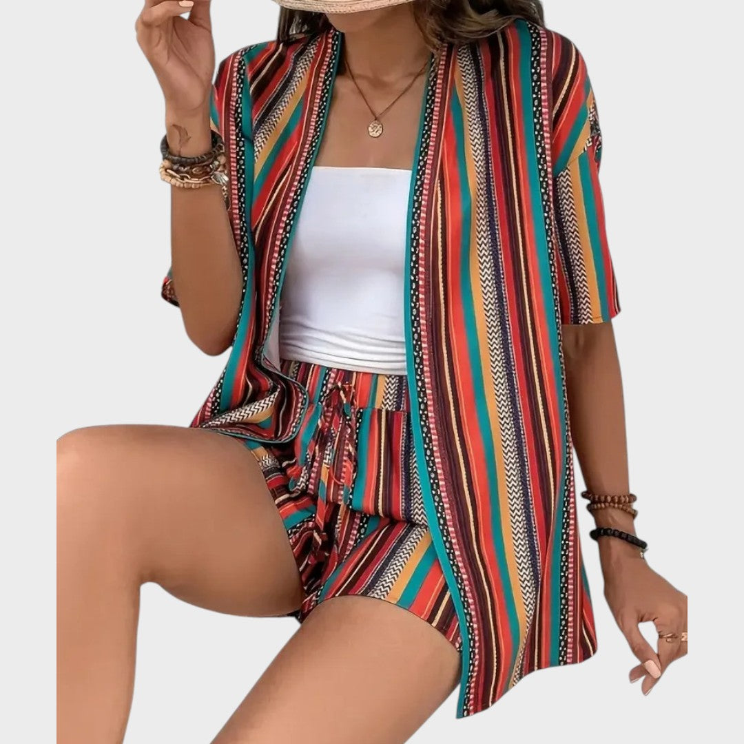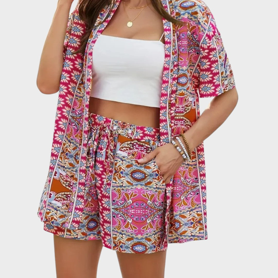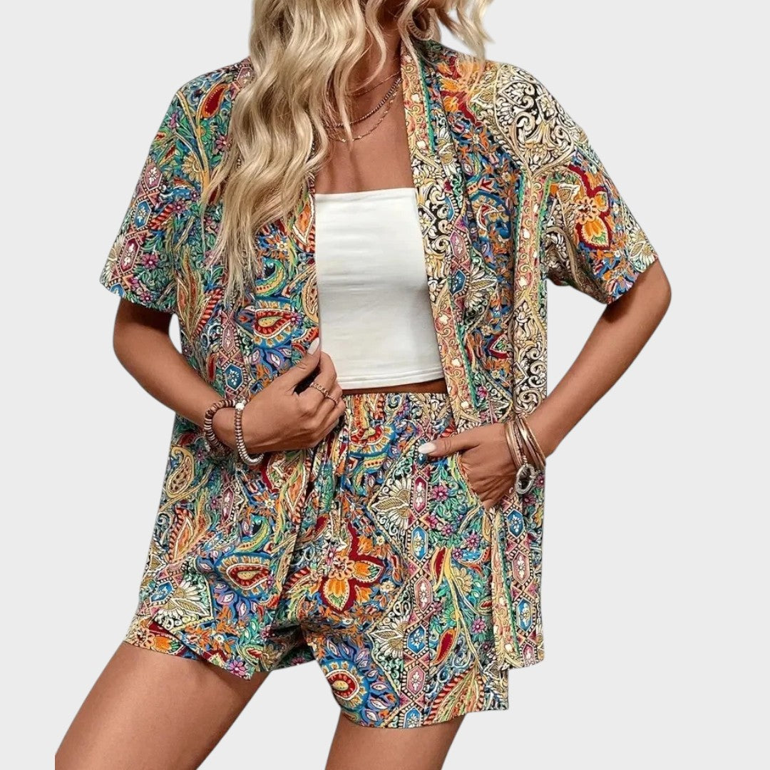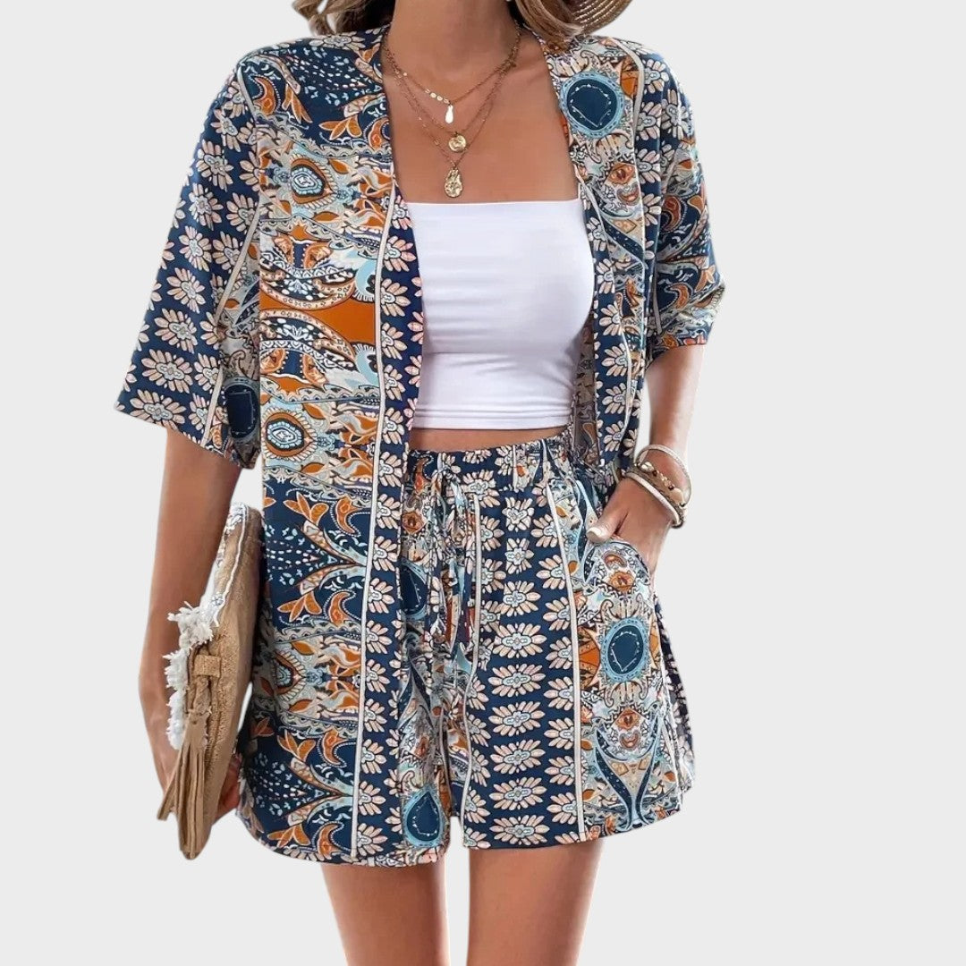 • Easy-breezy design – open shirt and comfy shorts for relaxed elegance.