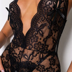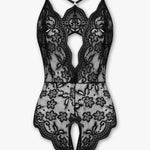 The Lyra Bodysuit reimagines classic allure with scalloped lace, floral embroidery and a daring crotchless design. A plunging halter neckline guides every gaze, while ribbon accents and exposed details promise easy access when the moment turns electric.