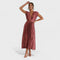 “Embrace the timeless charm of this terracotta pleated midi dress. Its deep V-neckline and defined waist create a feminine, sophisticated silhouette, while the fluid fabric moves gracefully with every step. Perfect for weddings, special dinners, or formal events, this dress is the ideal choice for those who want to shine with elegance and confidence.