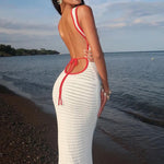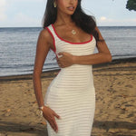 Sun-drenched and effortlessly magnetic, the Maribel Coastal Knit Maxi Dress captures the essence of endless summer. Crafted from a soft crochet knit that hugs the body in all the right places, it features a flattering scoop neckline trimmed with contrast edging for a playful, yet elevated finish.