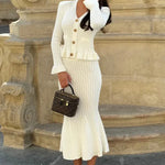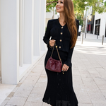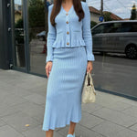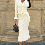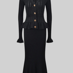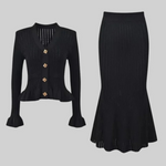 Elevate your everyday with the Mary Park Avenue Knit Set, a sleek and structured duo that blends luxury with timeless charm. Featuring a fitted button-up knit top with gold-tone detailing and a matching midi skirt that hugs in all the right places, this set is sophistication done right.