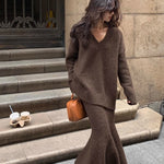 Cosy, elegant, and effortlessly elevated, the Noelle Soft Knit Sweater and Skirt Set is your answer to chic cold-weather dressing. Featuring a relaxed V-neck oversized sweater paired with a flattering fluted maxi skirt, this set combines comfort with polished sophistication. The plush knit texture drapes beautifully while keeping you warm and stylish.