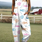 The Ocean Whimsy Jumpsuit brings playful charm and cool comfort to your laid-back looks. With its hand-drawn fish print in cheerful shades of pink, orange, and blue, this piece is a fun nod to seaside living. The loose, slouchy fit and rolled cuffs make it perfect for breezy days, whether you're lounging by the lake, running errands, or just enjoying some sun and silliness. Featuring deep front pockets, adjustable straps, and lightweight fabric, it’s a splash of joy you’ll reach for again and again.