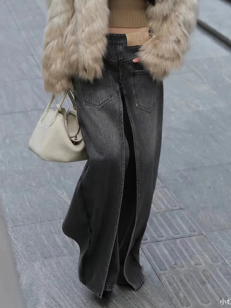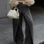 Edgy, daring, and unapologetically bold, the Phantom Split Wide Leg Jeans are designed to make a statement. Crafted from a washed black denim with an exaggerated wide-leg silhouette, these jeans feature dramatic front splits that add movement and attitude to every step. The structured back pockets and high-rise waistline balance the boldness with a flattering, sculpted fit.