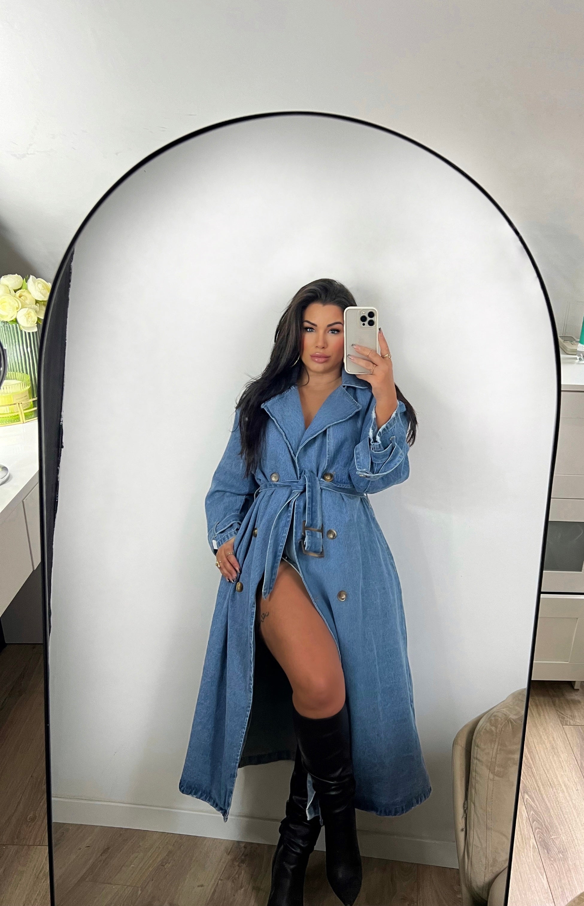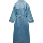 Effortlessly cool and refreshingly bold, the Presley Denim Trench Coat reimagines a classic silhouette with a laid-back twist. Featuring double-breasted buttons, a belted waist, and structured lapels, this coat fuses timeless trench detailing with the relaxed attitude of denim. Crafted in a soft, mid-wash fabric, it brings casual sophistication to your outerwear wardrobe.