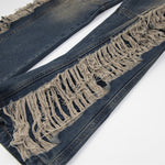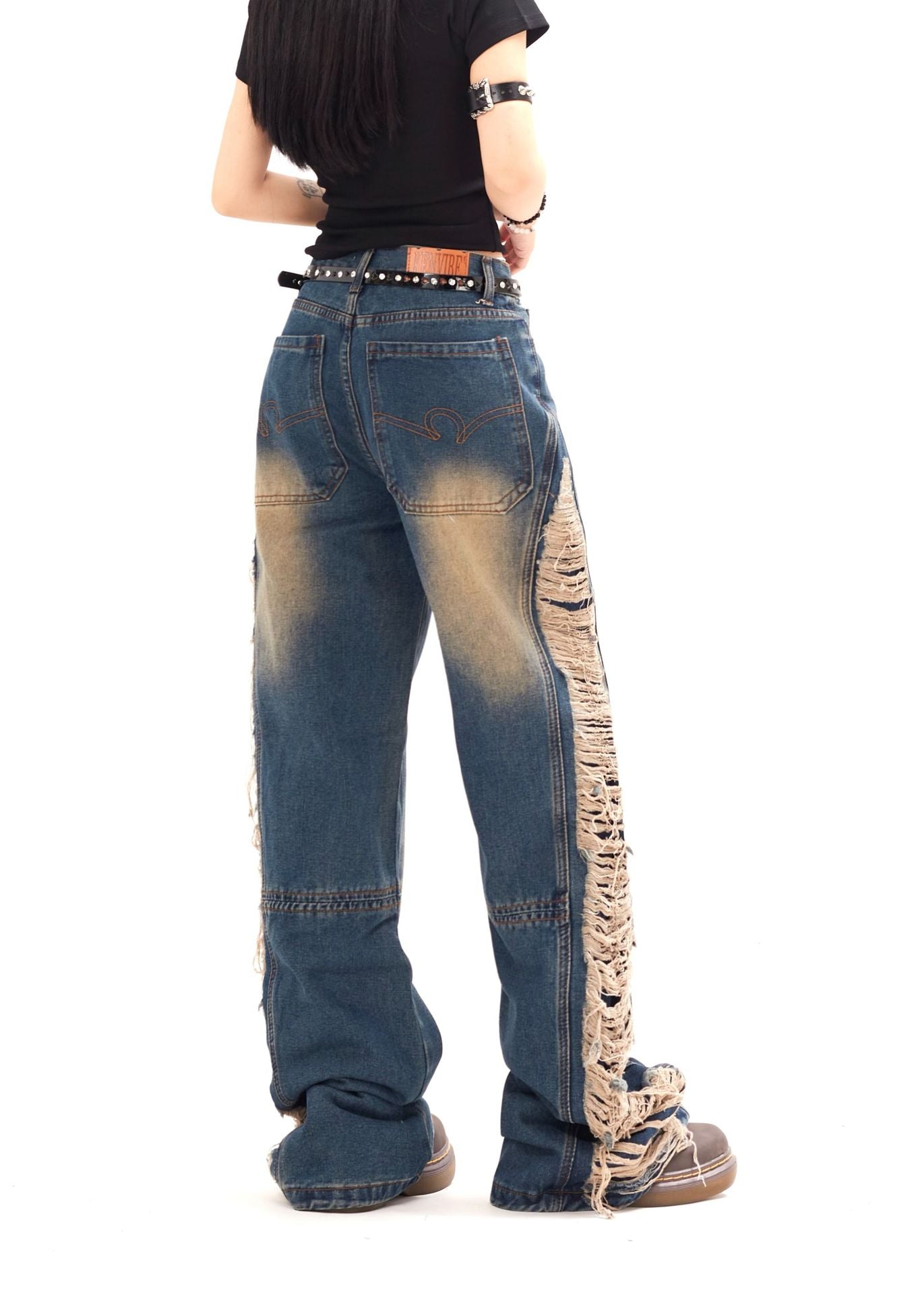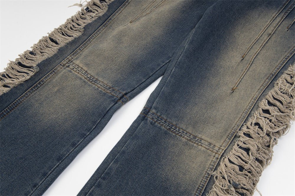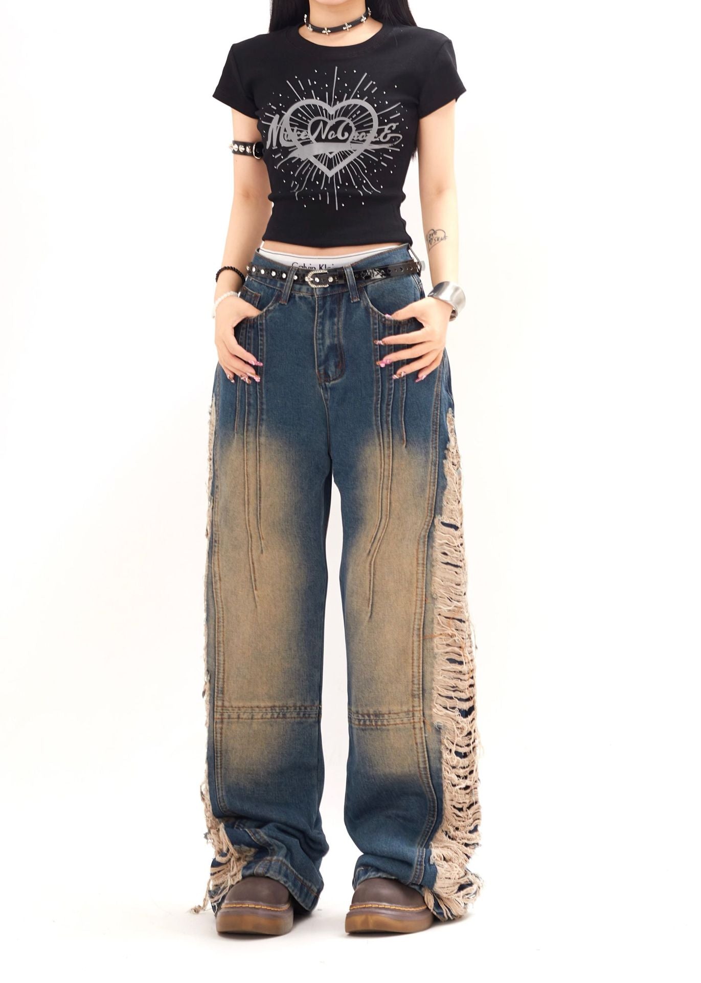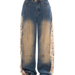 Turn heads with the Rebel Shred Contrast Fringe Jeans — a bold denim moment made for rule-breakers. These wide-leg jeans feature distressed fringe panels running down both sides, giving you that raw, grunge-meets-glam aesthetic. The heavy wash fade and detailed stitching add depth and dimension to the edgy silhouette.