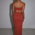 Bold, sultry, and made for unforgettable nights — the Riviera Sunset Two-Piece Set features a strapless twist-front bandeau and a matching high-slit midi skirt with flattering ruched detailing. This sleek, body-hugging set accentuates your curves while offering a daring yet sophisticated silhouette.