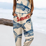 The Sardine Stroll Jumpsuit is a bold catch for anyone who loves to blend art, humor, and effortless style. With oversized blue sardine illustrations and a pop of red typography, this creamy canvas overall brings seaside whimsy to your everyday look. Made for beach lovers, creatives, and playful spirits, it features a relaxed fit, deep pockets, and adjustable straps—perfect for coastal wanderings or simply making a splash wherever you go.