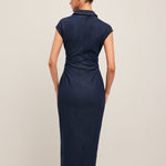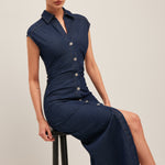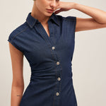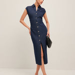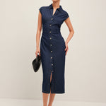 Step into effortless style with the Sienna Denim Button-Down Midi Dress. This modern take on classic denim features a flattering, figure-hugging fit with a button-down front and a subtle slit to add a touch of elegance. The cap sleeves and collared neckline bring a structured yet casual appeal, making this dress perfect for both day and evening wear.