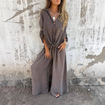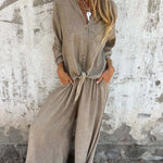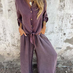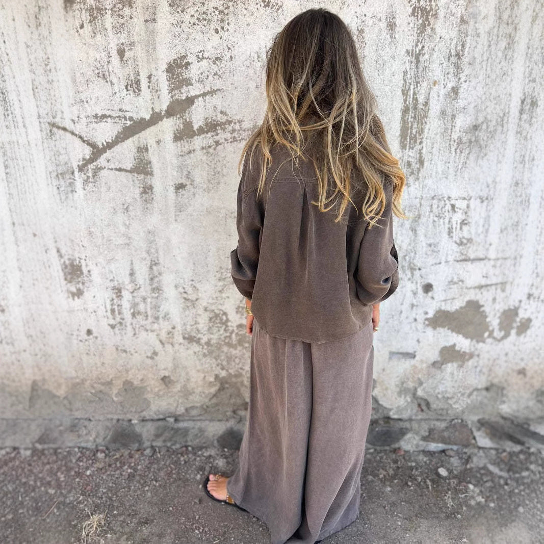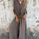 Slip into off-duty ease with the Solvra Washed Button-Tie Lounge Set, a relaxed two-piece made for sun-drenched days and slow living. Crafted from ultra-soft, garment-washed fabric with a naturally faded finish, this set includes a breezy button-up shirt with rolled sleeves and a front tie detail that adds a casual-cool twist. The matching wide-leg pants sit high on the waist and drape effortlessly, offering both comfort and understated polish.