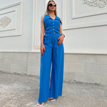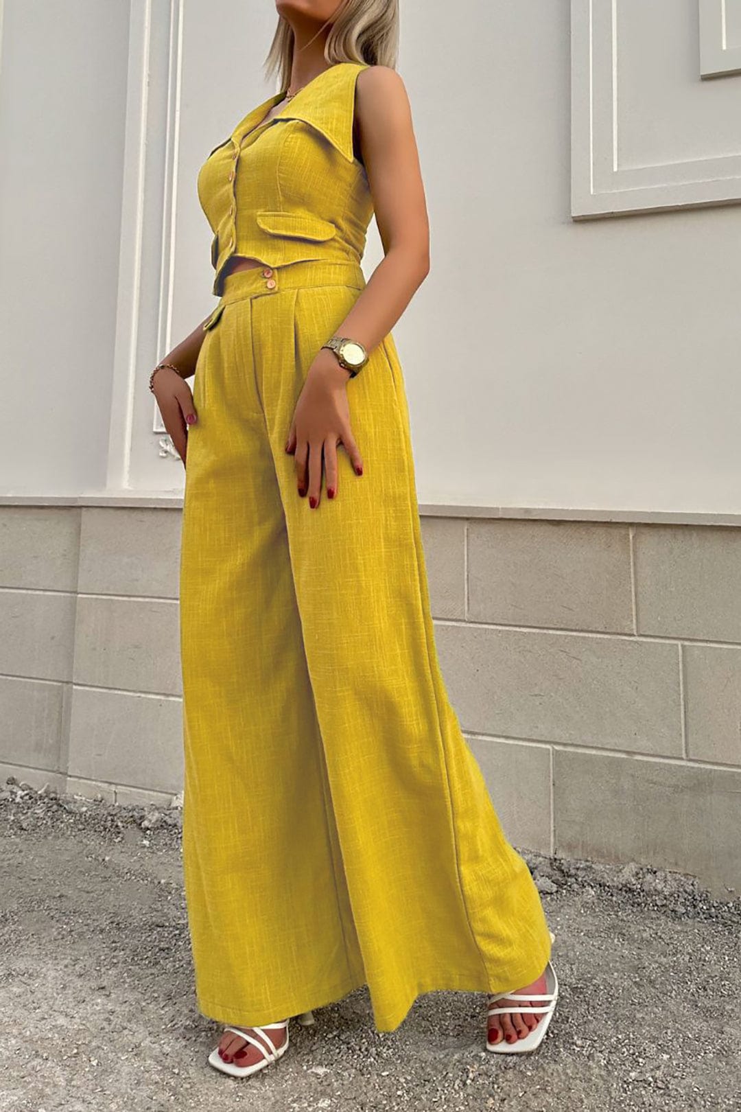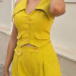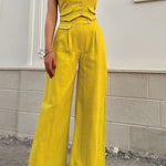 Bring an air of relaxed sophistication to your everyday wardrobe with the Sorrento Linen Button-Front Set, a breezy two-piece ensemble made for sun-drenched days. The collared crop top features a flattering button-up front and structured darting, perfectly balanced by wide-leg pants with tailored pleats and flap detail for a polished finish.
