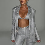 Dazzle after dark in the Stardust Vice Sparkle Set — a bold three-piece ensemble made to steal the spotlight. Featuring a shimmering oversized blazer, sleek tailored pants, and a matching bralette, this power set delivers pure glam with an unapologetic edge.
