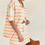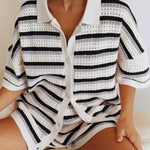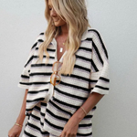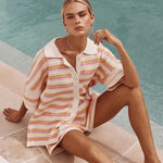 Slip into sweetness with the Sunstripe Knit Lounge Set — a retro-inspired two-piece made for warm afternoons and carefree lounging. Featuring a soft short-sleeve button-up top and matching drawstring shorts, this set brings playful energy with its pastel-striped open knit design and relaxed fit.