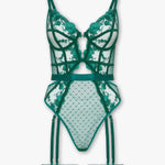 The Sylvie Bodysuit pairs sheer polka-dot mesh with delicate floral embroidery, creating a look that’s playful, refined and undeniably captivating. Decorative cut-outs and an underwired, cup-free design sculpt your silhouette, while a thong back keeps lines invisible and confidence sky-high.