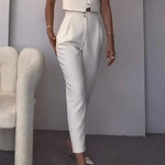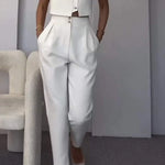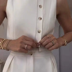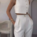 Chic, sharp, and endlessly versatile — the Vienna Tailored Vest & Tapered Pants Set is the epitome of modern sophistication. Featuring a structured sleeveless vest with front button detailing and high-waisted pleated trousers, this all-white ensemble is designed to command attention with effortless grace.