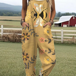 The Wildflower Buzz Jumpsuit captures the carefree joy of summer meadows and blooming gardens. Featuring a large, whimsical bee surrounded by bold floral illustrations on a warm golden yellow canvas, this piece is as radiant as a sun-drenched afternoon. Designed with a relaxed fit, practical pockets, and adjustable straps, it's perfect for artists, nature lovers, or anyone who wants to bring a little sunshine wherever they go. Throw it on, roll up the cuffs, and let your style bloom.